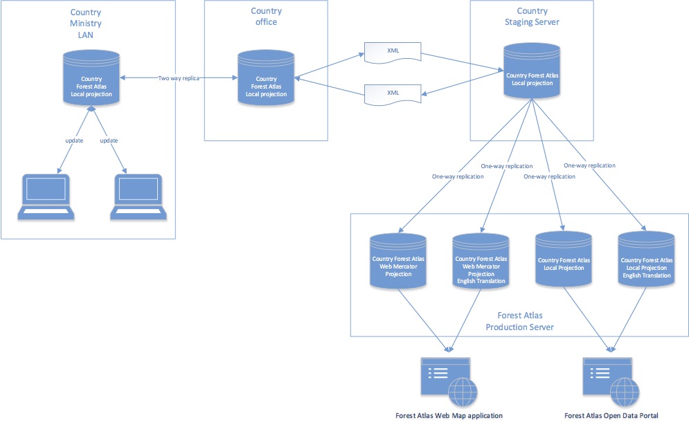 The public version is hosted on AWS and ArcGIS online to assure high availability. The technicians keep the system up-to-date using delta files to synchronize the online replica of the central geodatabase. Once in the cloud, data are further replicated into live geodatabases which hold copies of the geodatabase in different projections and languages. By translating domains and subtypes within ArcSDE, the Forest Atlases are able to display layers in different language (usually French and English) without needing to alter the underlying data. The data used in web applications are reprojected during the synchronization and directly stored in Web Mercator projection to ensure faster rendering and reduced load on the server while a separate copy in the local projection is kept for distribution via the Open Data Site.