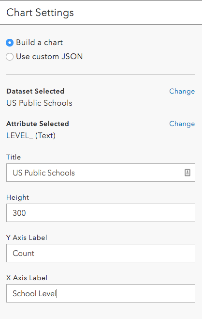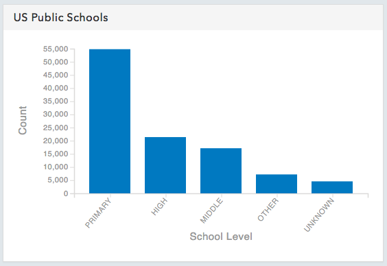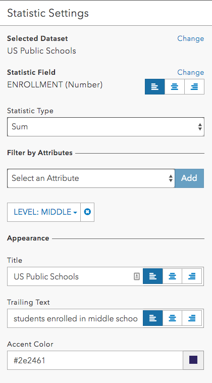Configuring a statistic card on your site will create a statistic based on the feature layer. You can select a specific field to calculate, determine the statistic type (sum, count, average, etc), add any filters, and finally configure the appearance. In the example below, we’ve added a dataset, US Public Schools. We’re then configuring the card to give us the total enrollment (sum) of students in public middle schools only, opposed to all public schools. We could filter by any of the fields present in the dataset to give us a wide option of statistics based on one single dataset. Behind the scenes, we’re querying the feature service and displaying the query response on the page.