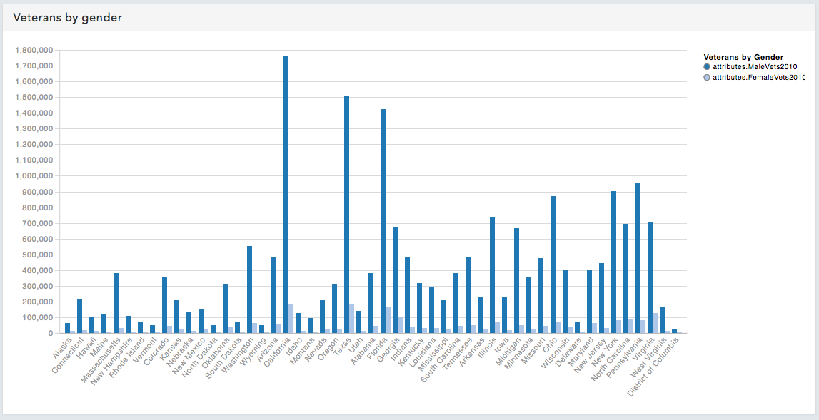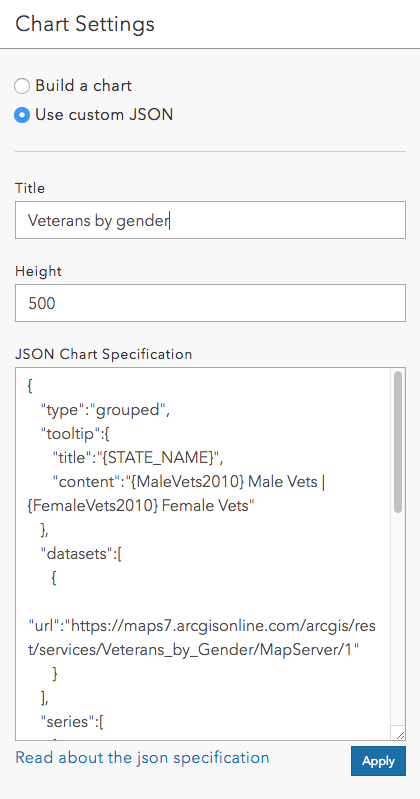 Alternatively, you can get more advanced by inputting your own custom JSON. The chart cards are based on Cedar, an open source charting library built at the DC R&D Center. Using Cedar you can include grouped bar charts, like below, as well as timelines, horizontal bar charts, scatterplots, and bubble scatterplots. Details are available in the Open Data documentation.