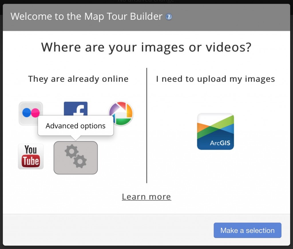 The process below assumes you already have your photos on the web somewhere like a web server, cloud file storage, or photo hosting service. It’s always a good idea to optimize your photos for the web by creating appropriately sized copies (more about this here and here). For each tour point you’ll want a larger image for the main photo (about 800 x 600 px) and a smaller thumbnail image for the carousel. If you are using a photo hosting service like Flickr, you don’t need to worry about this since resizing is handled automatically.