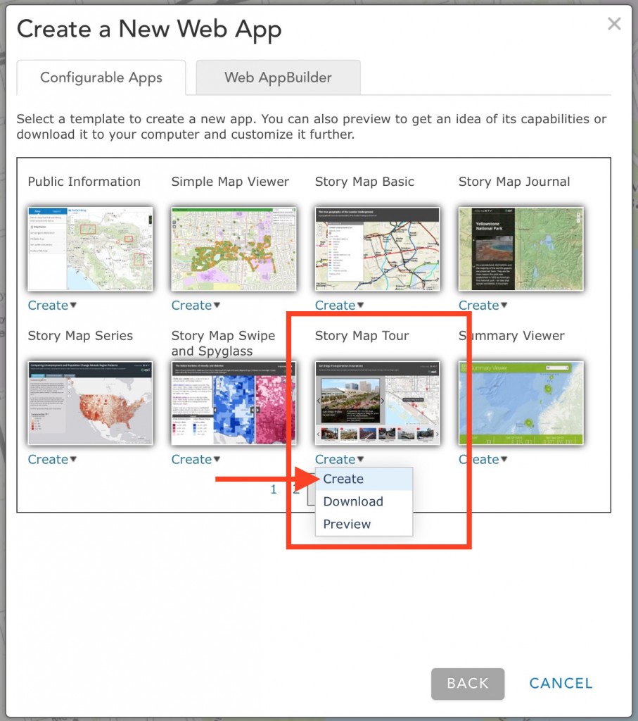 First you’ll need to download a CSV template that has the required fields and field names needed by the Map Tour app. Go to the Story Maps Apps page, click Build a Map Tour, choose Advanced Options, then right-click Download the CSV template.