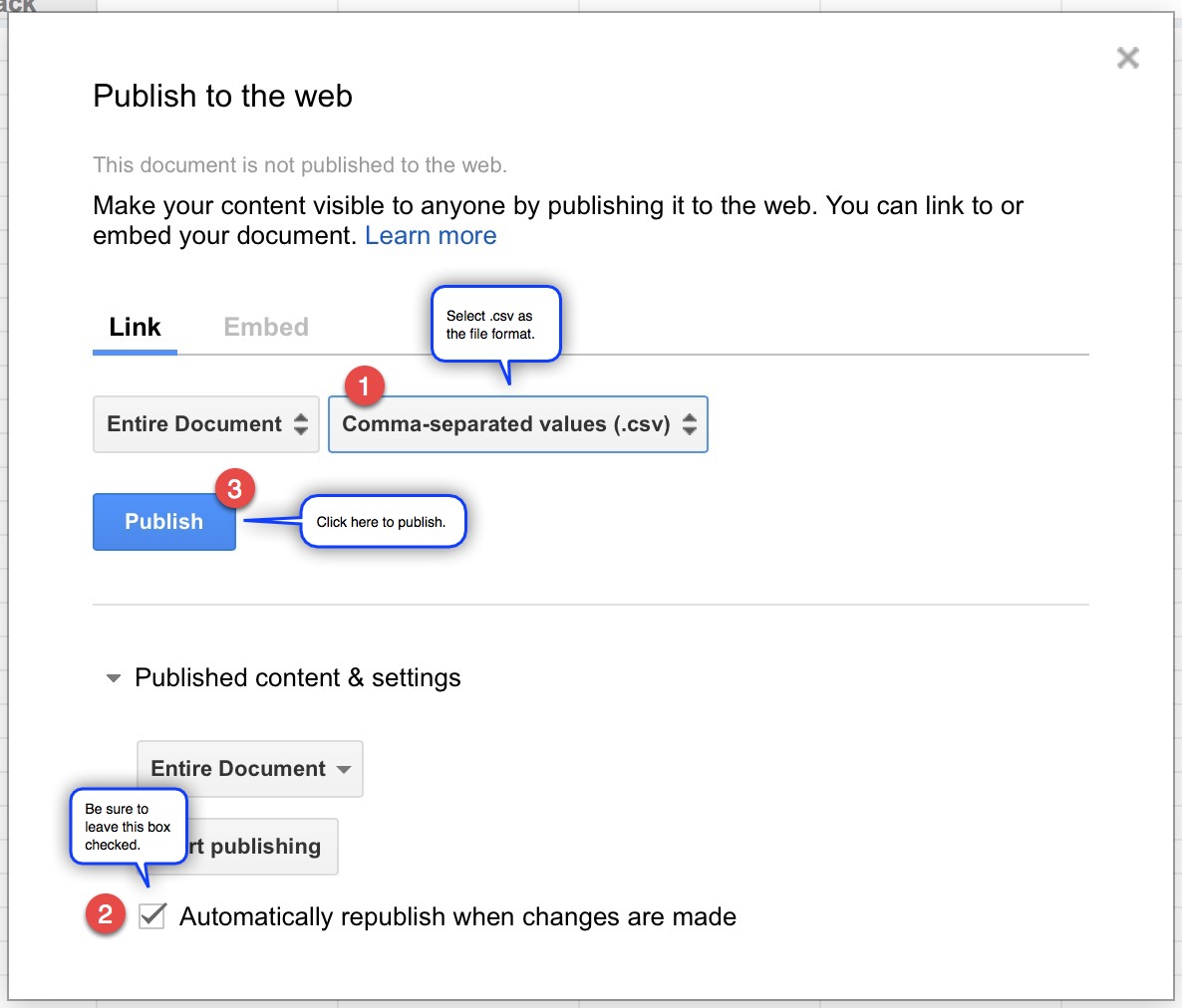 Once your file is ready choose Publish to the web… from the File menu. Then 1) choose CSV as the format, 2) make sure auto-republish is enabled, and 3) click Publish to make the file available on the web for your Map Tour.