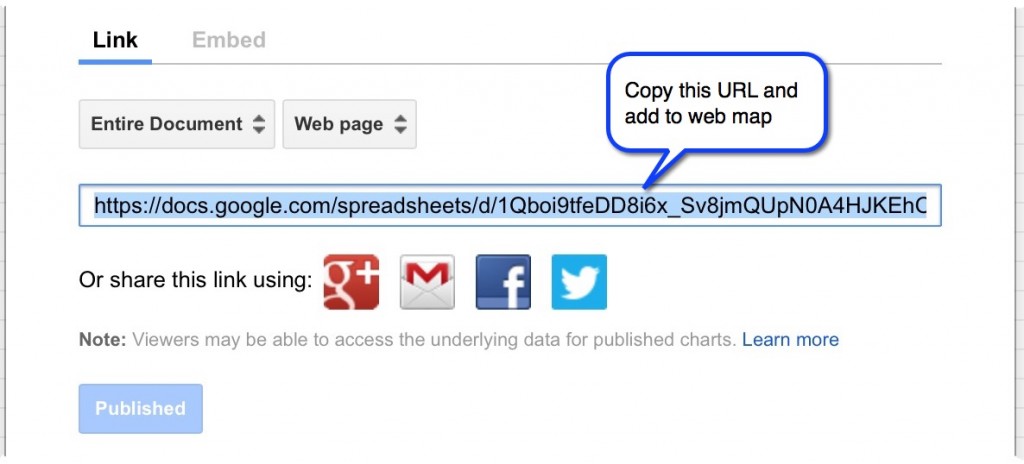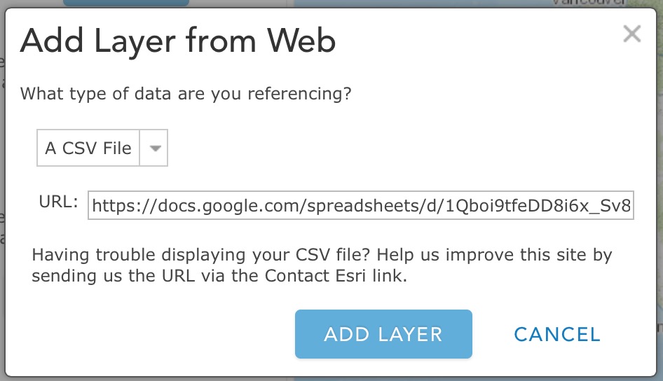 Another interesting option, and the subject of the rest of this blog, is to upload the Map Tour CSV to a cloud document service such as Google Sheets and link to it for your Map Tour points. An advantage of using a cloud-hosted spreadsheet is that you can enable others — even people without ArcGIS Online accounts — to easily add or modify your tour points. Anyone you authorize can edit your spreadsheet and their changes will show up in your Map Tour. You could even use this workflow to crowdsource a Map Tour by making the spreadsheet editable by anyone or linking your Sheet to a Google Form.