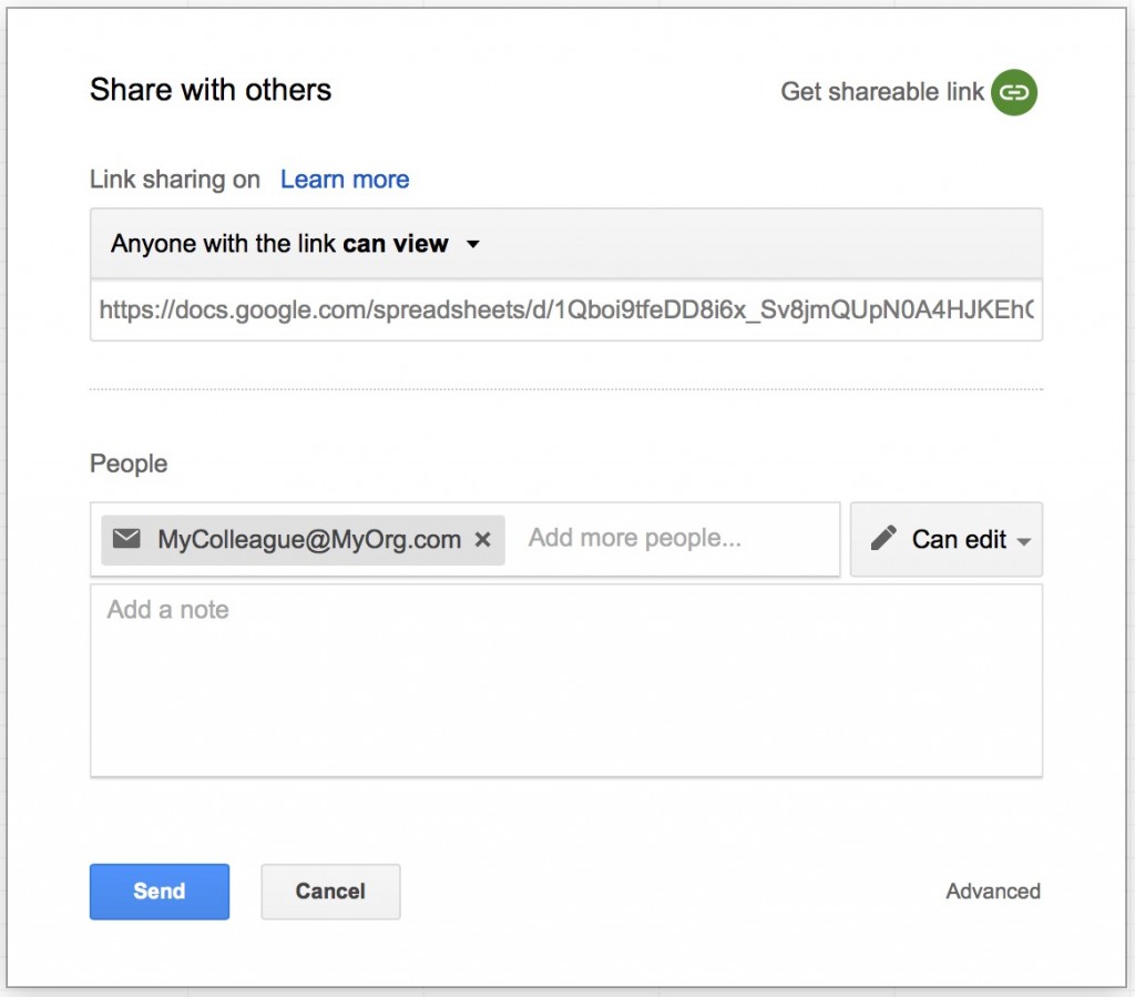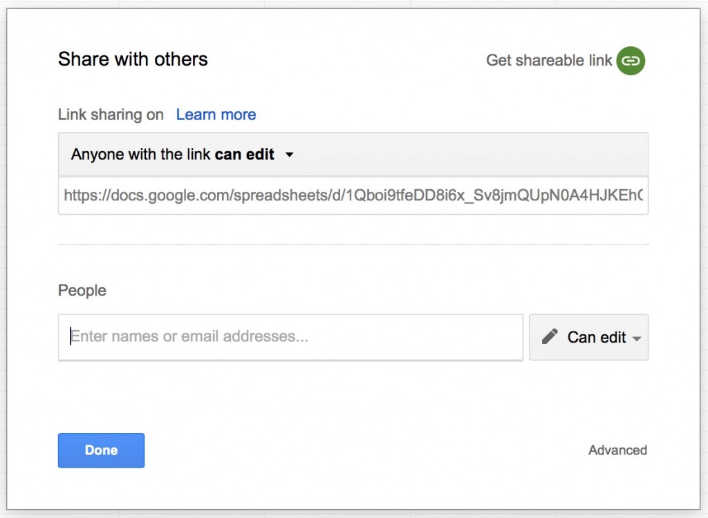 At this point you can optionally invite others to edit your spreadsheet. Just click File…Share… and enter the email addresses of your colleagues and make sure “Can Edit” shows next to the addresses.
