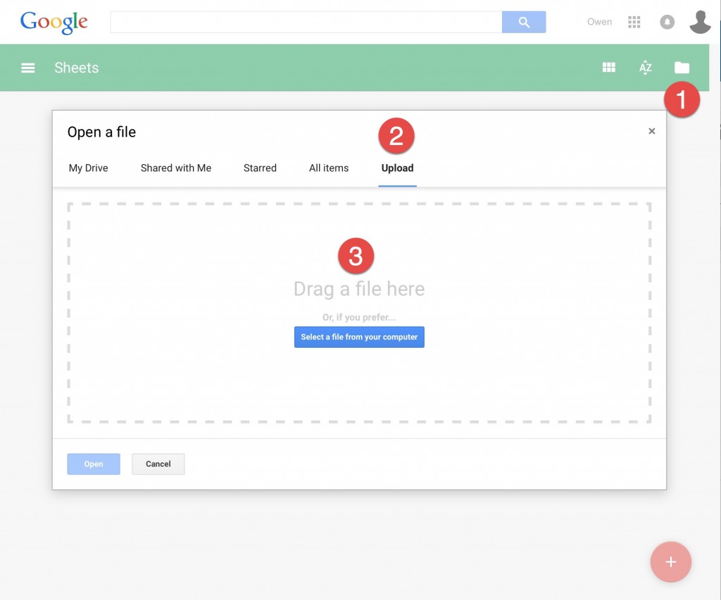 Now log in to Google Sheets and upload the CSV template by 1) opening the file picker, 2) selecting Upload, and 3) dragging or browsing to your file.