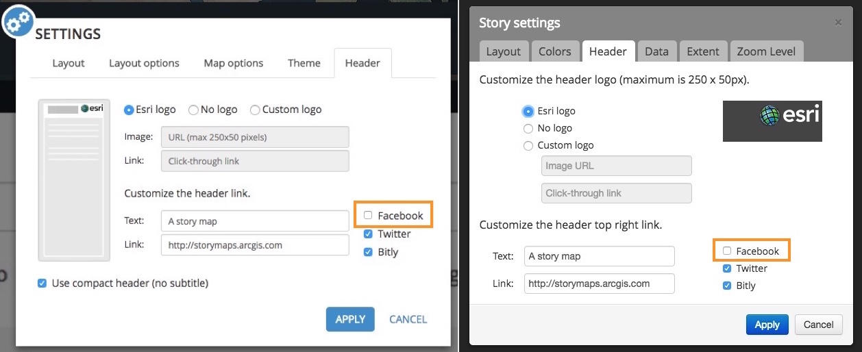 For stories created with Story Map Journal, Story Map Series, Story Map Tour, or Story Map Swipe/Spyglass open the Builder, go to Settings > Header, and uncheck Facebook.