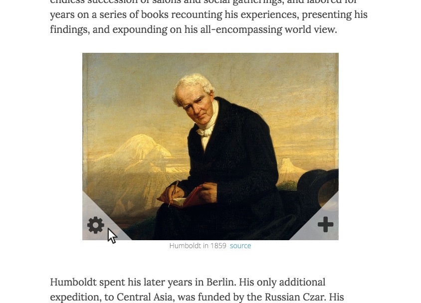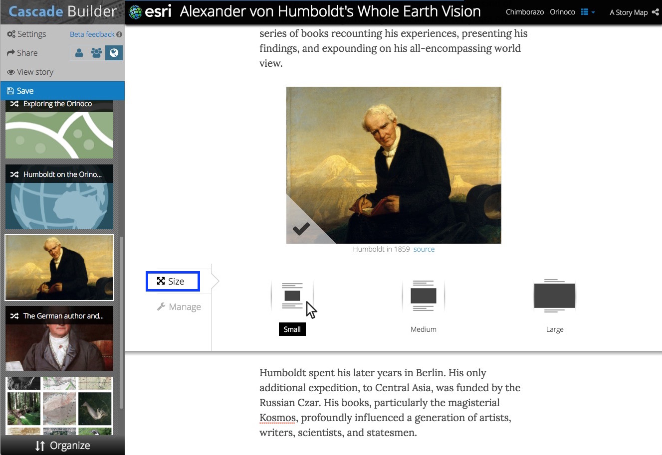 If your media is in a narrative section you can adjust its size. The larger the size the more space you provide for your readers to see or explore the media (you’ll learn more about letting your readers explore later in this post).