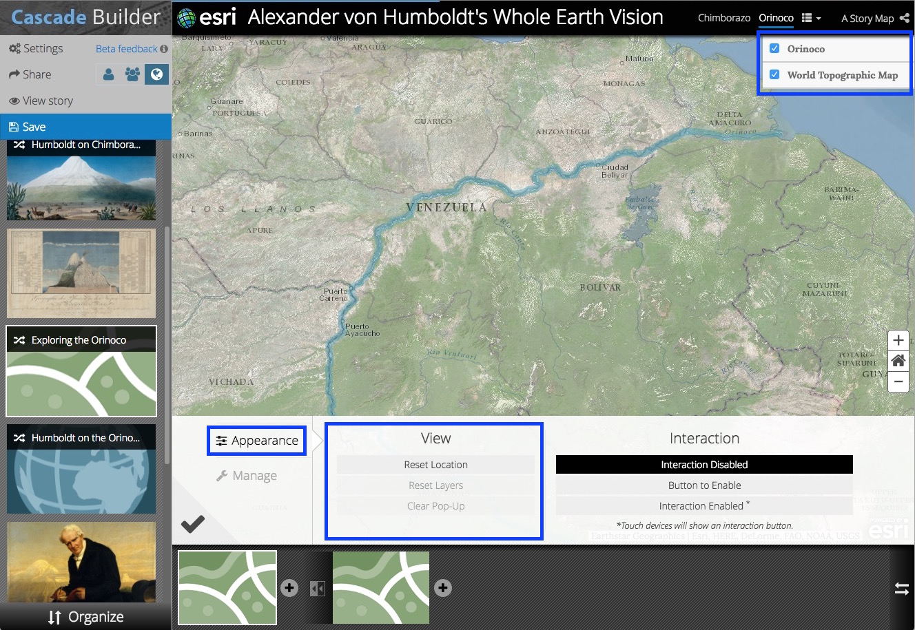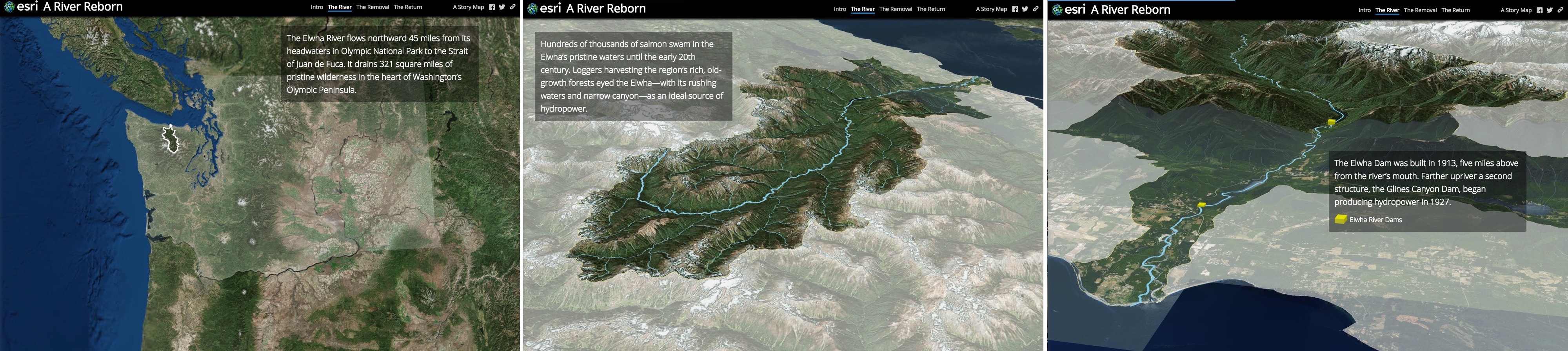 For example, open the River Reborn story and scroll through the web scene in its first section. It gives the reader geographic context for the story by first showing a view of Washington state and the location of the Elwah River and then showing two perspectives of the river itself, the second of which shows the location of two dams. Imagine what a different experience this would be if the author had just added the scene to the story and asked the readers to navigate the scene and toggle layer visibility on their own.