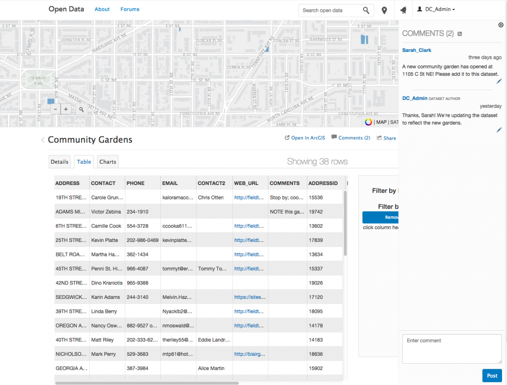 Administrators can create a feedback loop by allowing the public to comment on datasets and granting citizens an opportunity to communicate directly with providers who maintain the data. Comments can help improve data quality and help an organizations focus their data maintenance efforts. Public users will need to sign-in with an ArcGIS Online account to comment and be notified of your updates.