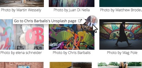 Of course it is good practice to credit others’ work, so we encourage you to consider adding image credits to the caption or credits section of your story even if you do use images from Unsplash. If you want to check out the photographer’s page on Unsplash hover over an image, then click the profile pic that appears in the upper right.