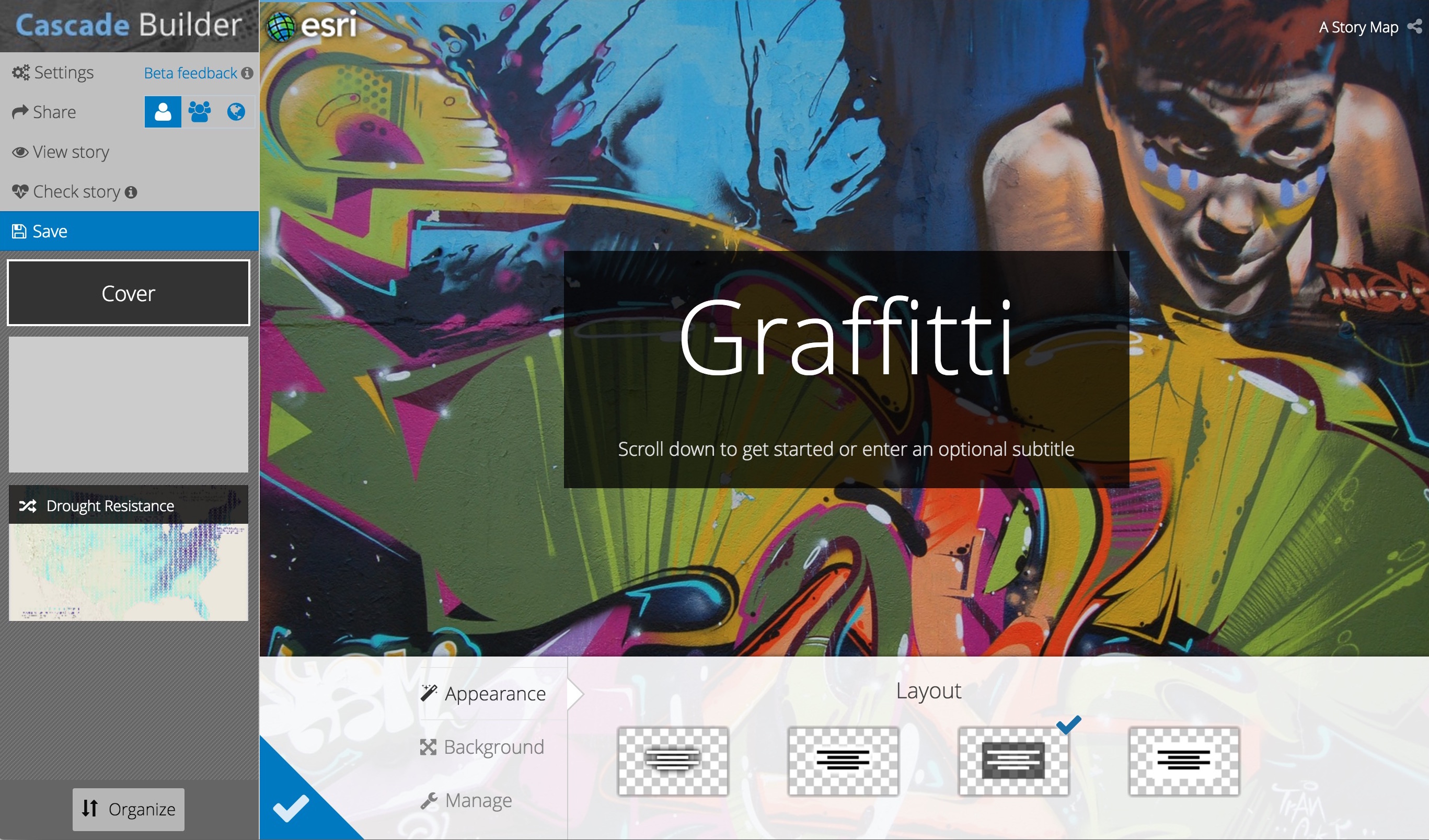 But before we get to the new stuff, we’d like to thank everyone who submitted feedback on the first Cascade beta release. We used your feedback to focus our development efforts and we encourage you to continue to communicate your requests and issues to us on GeoNet, which you can easily find via the “Beta Feedback” link in the Cascade builder panel.