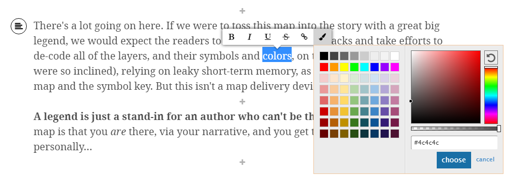 You can now use color to format narrative text and captions in narrative sections and immersive section panels.