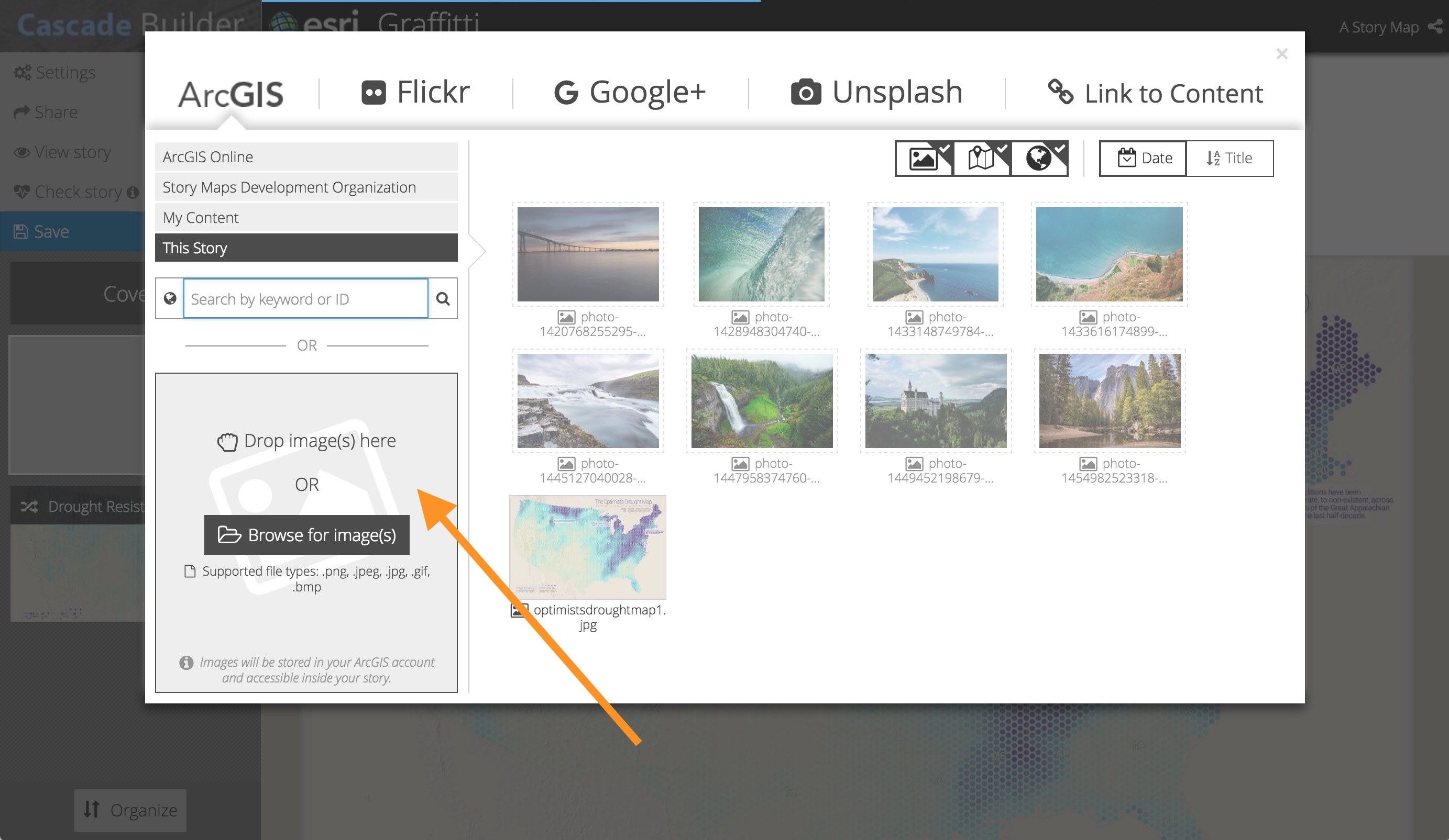 It’s also easier to get images from your computer into your Cascade story because you can now upload multiple images at once. Just drag a batch of images onto the drop zone on the ArcGIS tab of the Media Picker and they will all be loaded into your ArcGIS account.