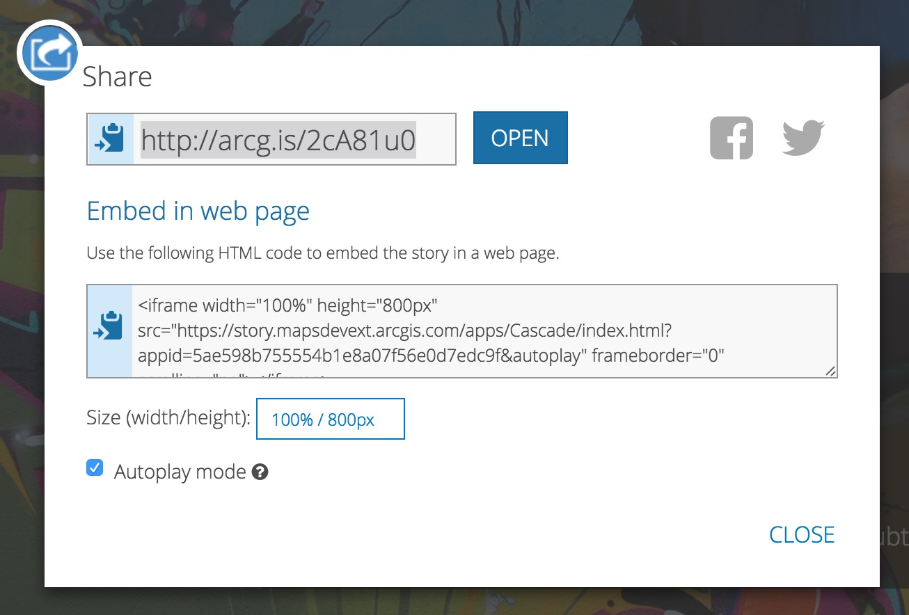 Your beautiful Cascade stories can now be set to play unattended at a trade show kiosk or on a large display monitor in your lobby using autoplay mode. Click the share icon at the top right of the story and check the box to enable autoplay mode. The URLs in the Share panel will update so you can Open your story in autoplay mode or copy it to send to someone else.