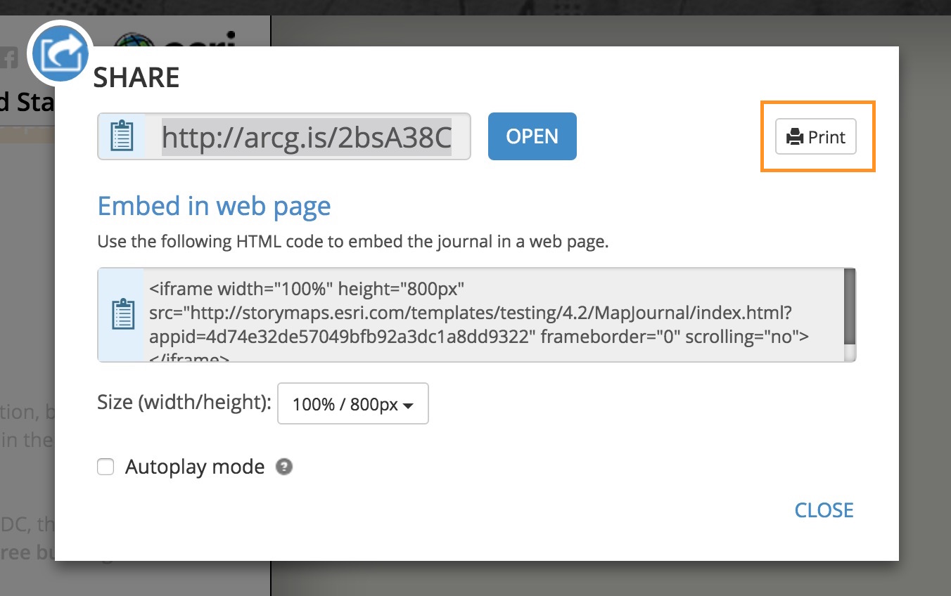 Printing is available from the Share panel. Note that content like videos and interactive web apps cannot be printed. This is a first release of this feature and we want to hear your feedback about how it works for you, so please share your reactions and suggestions about printing with us on GeoNet.