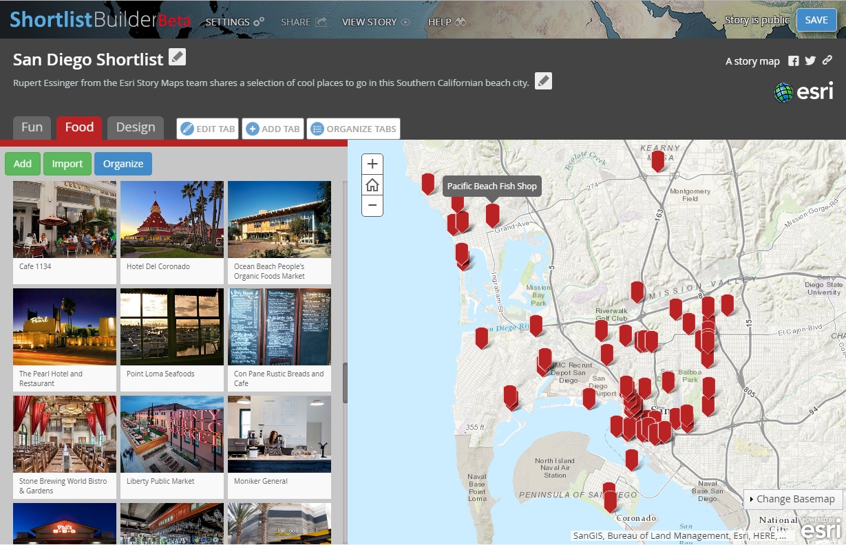 The Story Map Shortlist (beta) app lets you present places of interest organized into tabs, making it fun and easy for people to explore what’s in an area. Shortlist was previously only available as a code download that you needed to host on your own server. With this release Shortlist is available in ArcGIS Online and features an interactive builder that makes it easy to author. The app also has a refreshed look with support for larger images. You can see an example here.