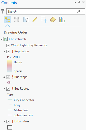 When you open a map or scene, ArcGIS Pro looks for the data referenced by each of the layers in the open map. When a data source cannot be found for a particular layer, that layer doesn’t draw. It only takes one glance at the Contents pane, and you’ll see those red exclamation points next to the layer that indicate a broken source.