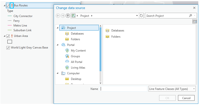 - If you have several layers that reference the same data source, that need to be fixed, you can repair the links one time in the Contents pane and ArcGIS Pro automatically repairs other broken layers. For example, if you have several feature classes stored in the same geodatabase, and the geodatabase has been renamed. Click the red exclamation point next to the layer to open the Change Data Source dialog box and browse to the correct source.