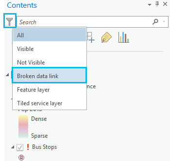 - You can quickly filter the Contents pane to show only the layers with broken data source links by clicking the Filter icon and click Broken data link.