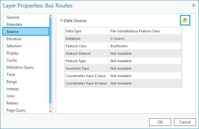 - If you only want to repair a link for one layer, you can change the data source property by right-clicking a layer and clicking Properties. On the Properties dialog box, click the Source tab and click Change data source to browse to the correct source.