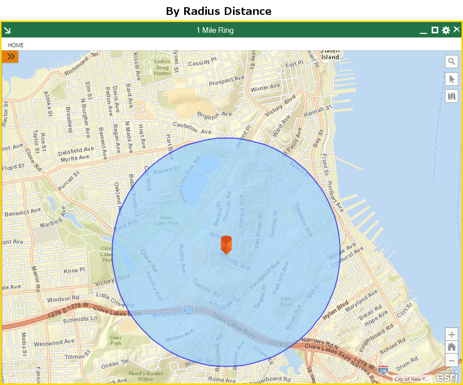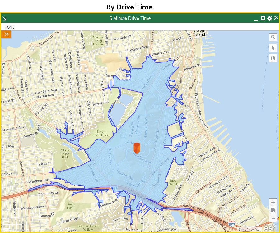 When a retail store is deciding where to locate its next store, for example, drive-time analysis like this is critical. After all, it is far more relevant to know the characteristics of people who live within a 10-minute drive of your store, than of people who live on the other side of the lake (who would be better served by other stores) just because they fall within a 1-mile radius.
