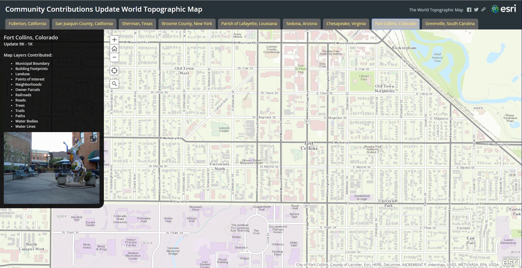 The most recent World Topographic Map release includes new Community Map contributions for cities and counties across the United States. These contributions help enhance content in the Living Atlas of the World and add value and usability to Esri’s online basemaps. Through the Community Maps Program, Esri continues to incorporate useful large-scale features as these examples will show. See information below about becoming part of this community.