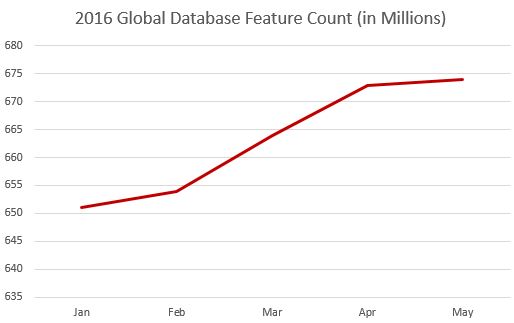 The global feature count for Community Maps has been steadily rising in this first half of 2016. A big thanks to all of our contributors around the world!
