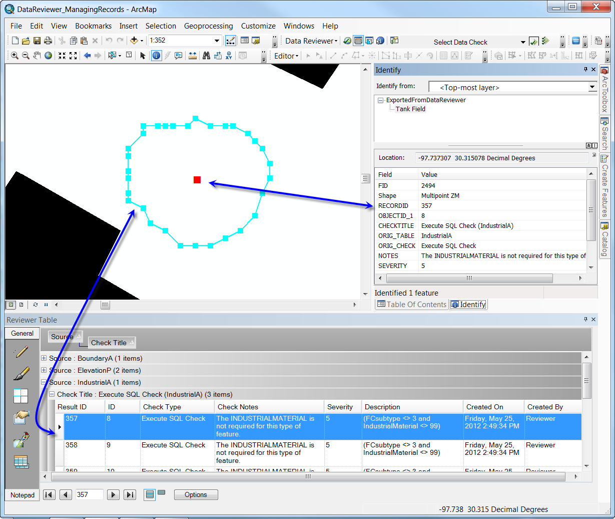 The point shapefile allows others to visualize and navigate to where the errors occur and includes information from the Reviewer record such as the check that identified the record and notes. The following image shows a new point feature created from a polygon error record. A comparison of the features’ attributes illustrates how the export works.