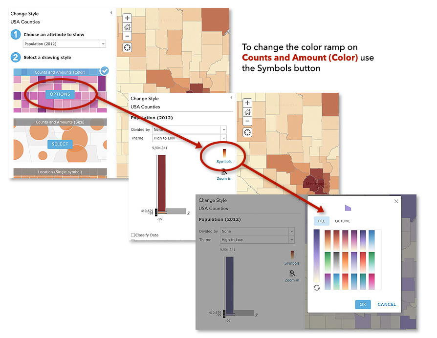 When mapping numeric data using Counts and Amounts (Color) there are many attractive color schemes (“ramps”) to use under the Symbols button. Don’t forget to also explore the different ways to use color in the Themes pulldown.