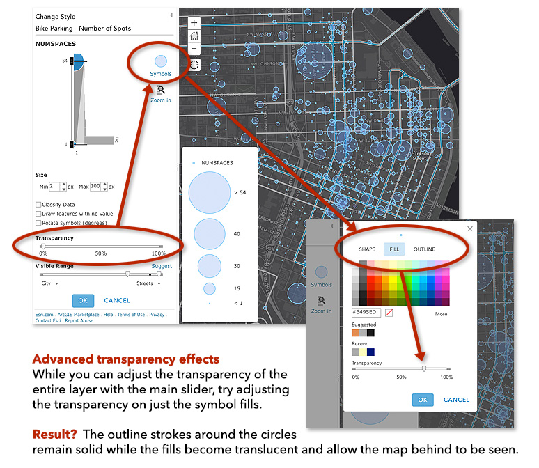 Sometimes you might want finer control over the transparency of your map symbols, more than can be achieved with just the layer transparency, since it applies to everything in the layer. A favorite technique of cartographers is to apply semi-transparent fills and solid strokes to Counts and Amounts (Size) maps.