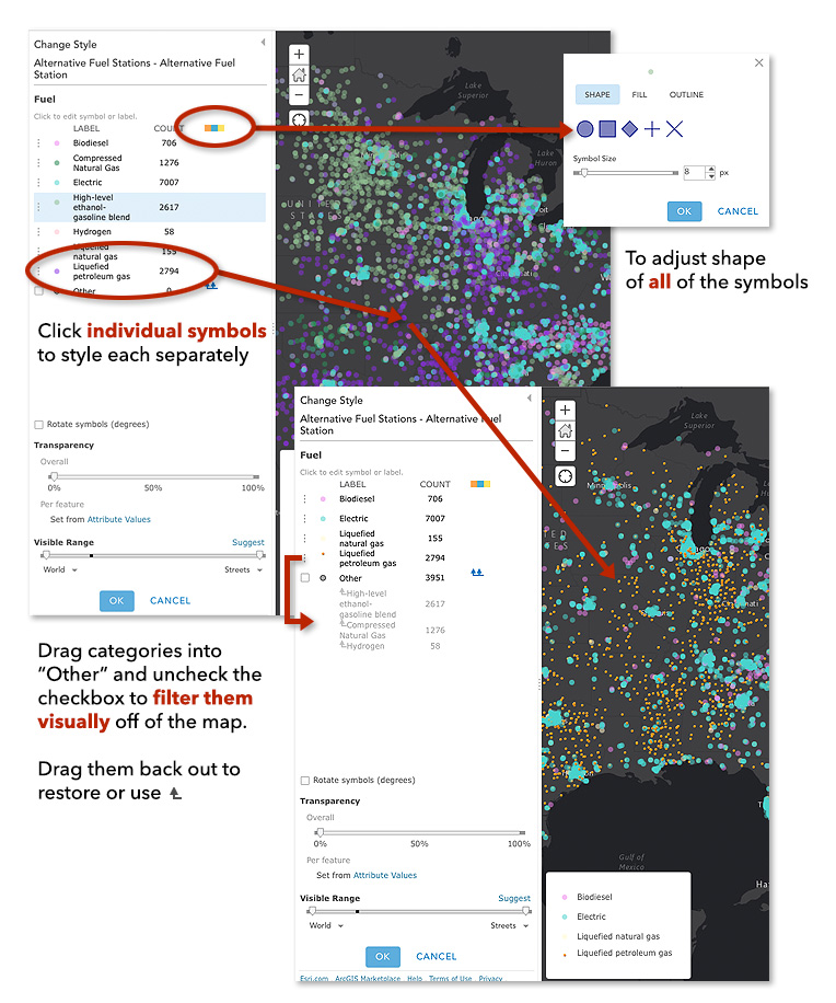 Categorical data is best mapped as Unique Value maps. Categorical data includes things like tree species, fuel types, and political parties: they’re different categories of things. To change the look of a single category/symbol (e.g., change the shape, color, size) click the symbol right beside the class name. To change the look of all symbols (e.g., change all classes from circles to squares) click the Symbols button (the three color boxes).