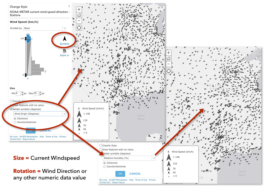 When working with point features that have numeric information, it is quite easy to map the size of the symbol using one attribute (say, wind speed) and then rotate those symbols proportional to some other attribute (say, wind direction). When combined with the position of the symbol, each point of the map communicates three pieces of information.