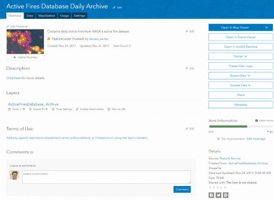 To get started, go to the item page for your hosted feature layer. From the Overview tab, you’ll notice a new menu button on the right called Update Data. Click it and you’ll find. Append is also accessible from the Data tab.