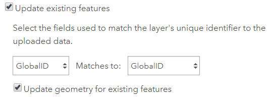 The Update existing features option works by matching the ObjectID or GlobalID (We want to expand that to user-driven unique IDs in a future release) from the feature layer to a field of the same type in the file that contains the updates. If there’s a match, the existing feature’s attributes are updated. If a feature in your upload file has no match based on the ID, the feature will instead be inserted into the feature layer, resulting in an upsert (matching records are updated, new records are inserted).