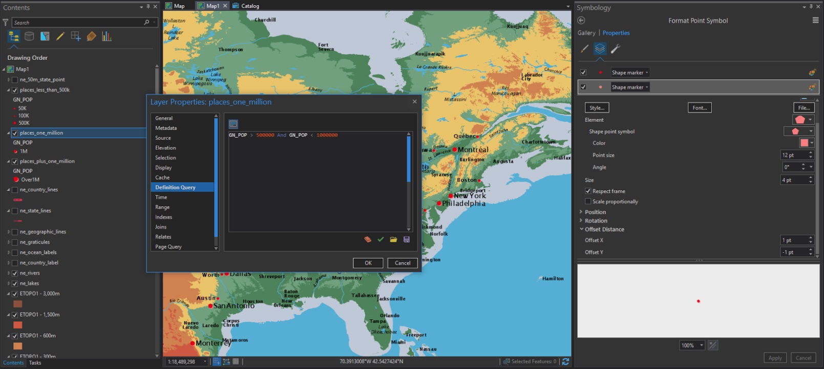 Some reference would be nice. The original map uses simple red symbols (circles, squares, and triangles) to denote population hierarchy with labels to the left or right of the symbol. The Natural Earth Populated Places (ne_50m_populated_places) layer contains points with population numbers attributed that we can use to replicate the map’s style. I added a pink (1, -1) offset shadow to make them pop just a bit in my version.