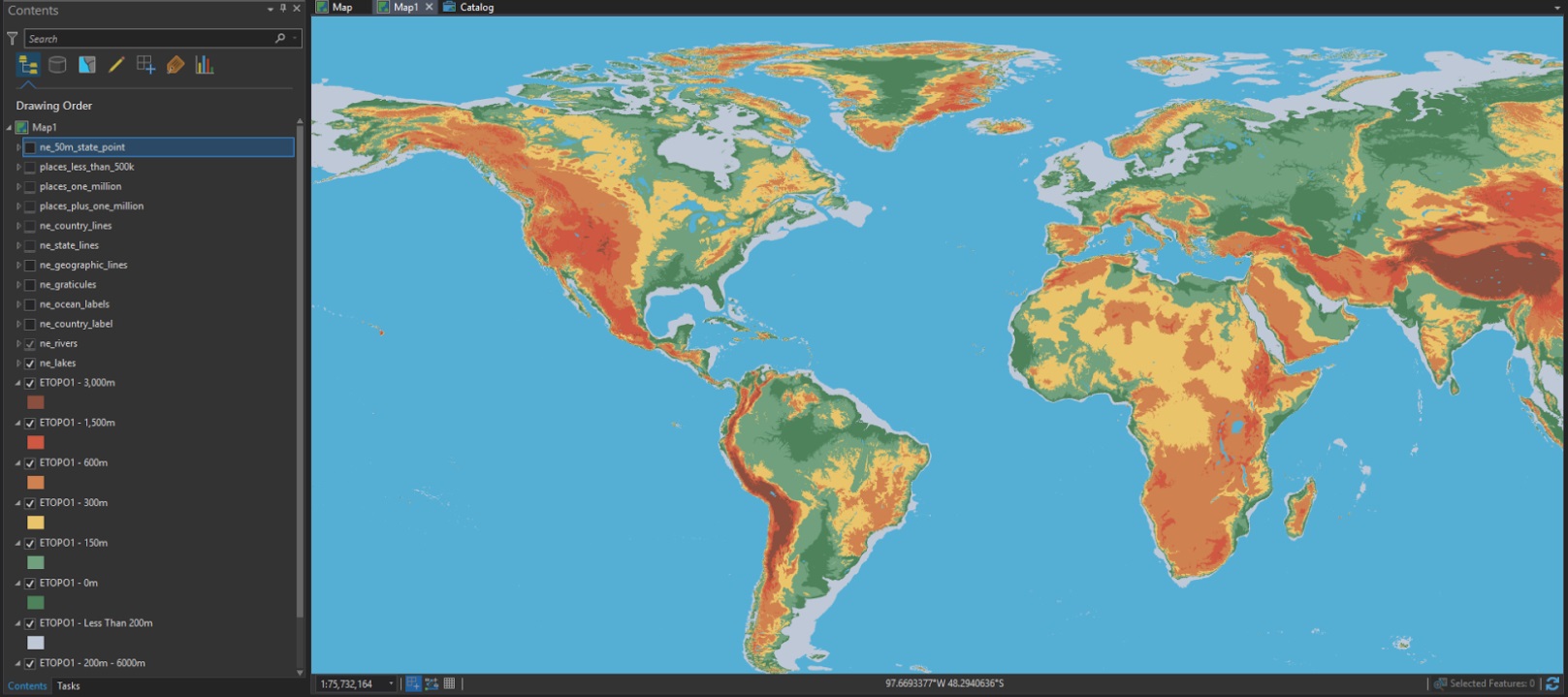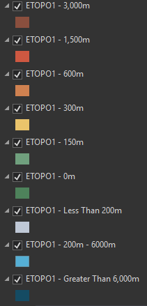 For my digital re-creation, I used two main datasets: Natural Earth data and a polygonized version of ETOPO 1 raster data.