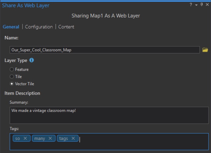 And that’s it—we’re ready to share it (Share > Publish Web Layer). Fill out the Name, Summary, and tags, and be sure to check “Vector Tiles” because we are baking tiles and a baker’s gonna bake 🙂