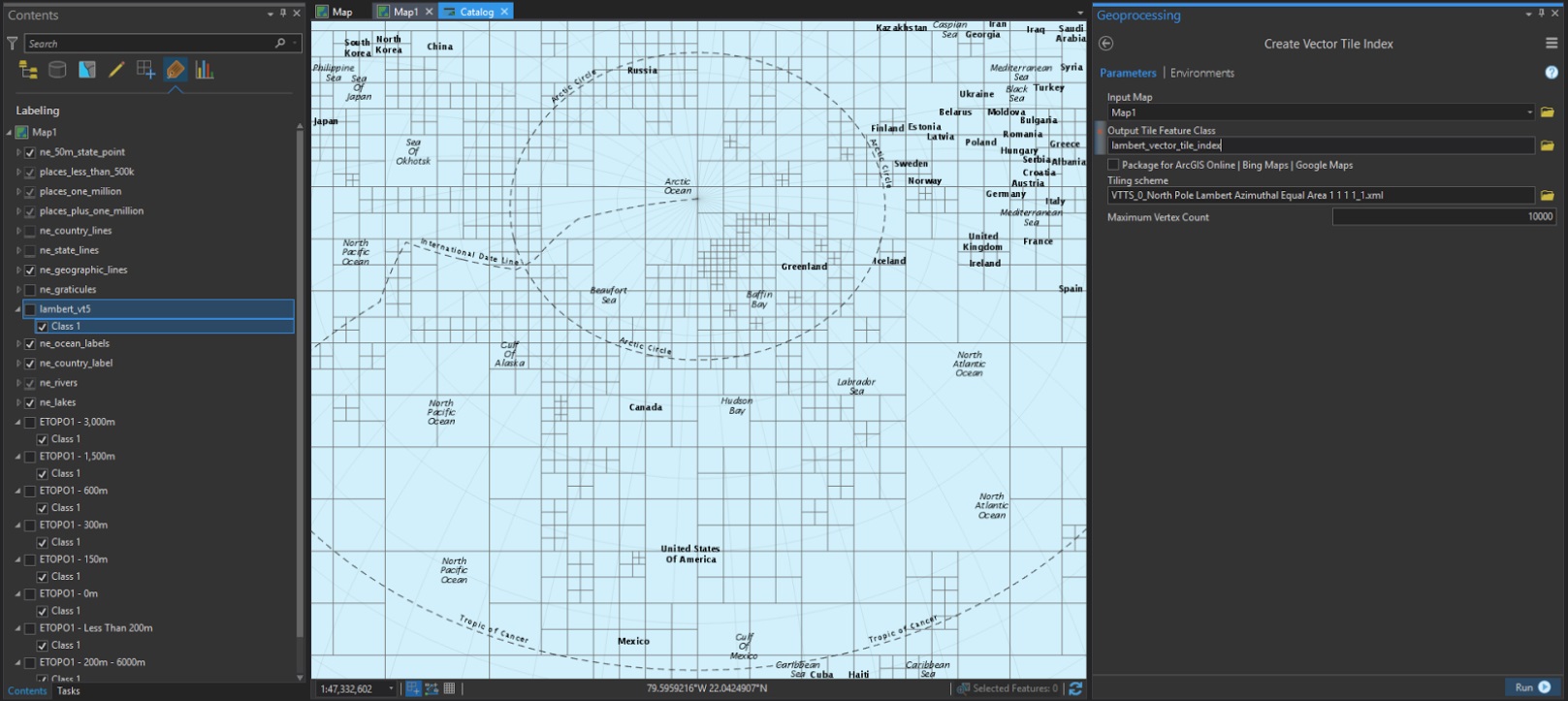 First, we need to create a vector tile index—this will look at our data, and chop it up appropriately for each zoom (Geoprocessing > Create Vector Tile Index) so tiles are created efficiently and quickly. The mesh actually looks pretty cool.