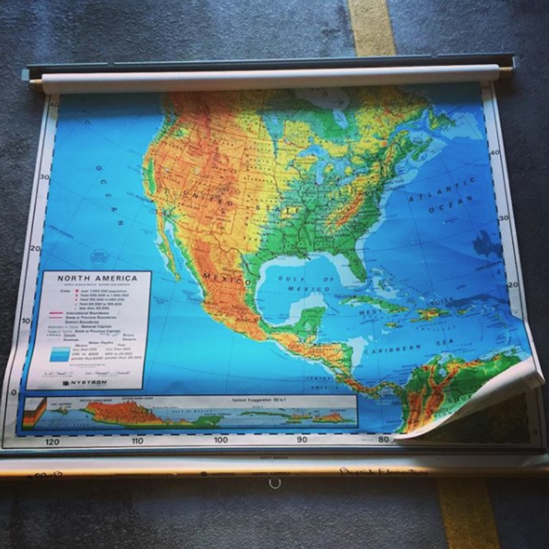 A few years ago, while I was at a state GIS conference, I used some free time to peruse the shops in Downtown Charlottesville, Virginia. I came across a vintage store and absolutely fell in love with an old Nystrom classroom pull down map hung up on the wall. I instantly purchased it, then I did what any normal cartographer would do – re make it!