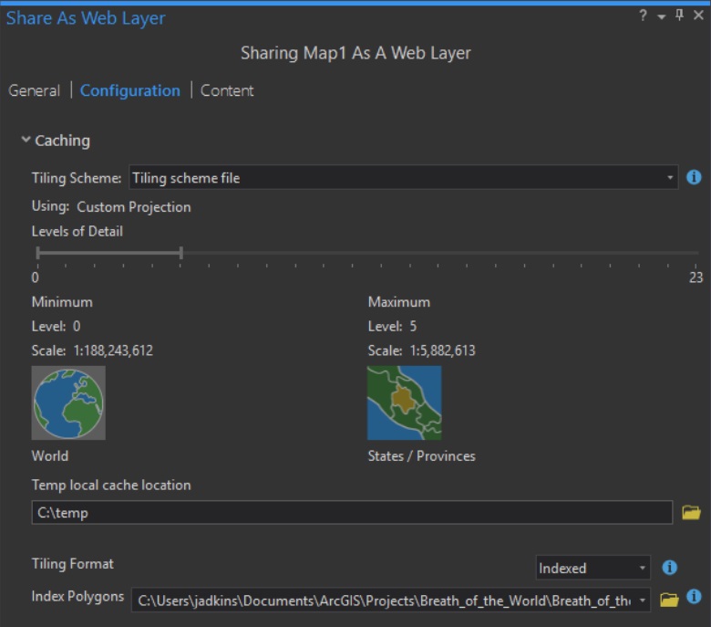 The important thing to note here is to un-check the “Package for ArcGIS Online”. This will ensure we create tiles in our lovely custom azimuthal coordinate system, rather than in typical web Mercator.