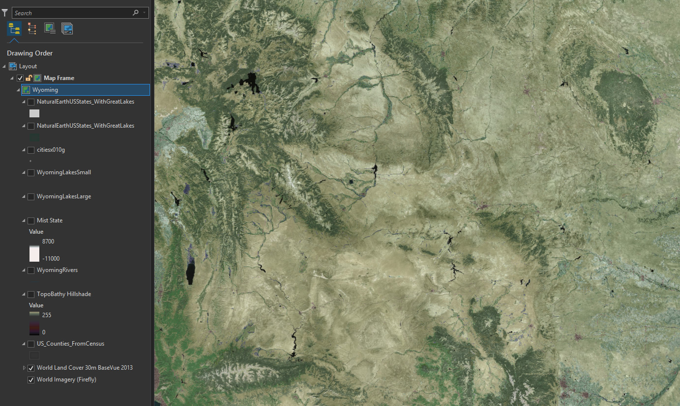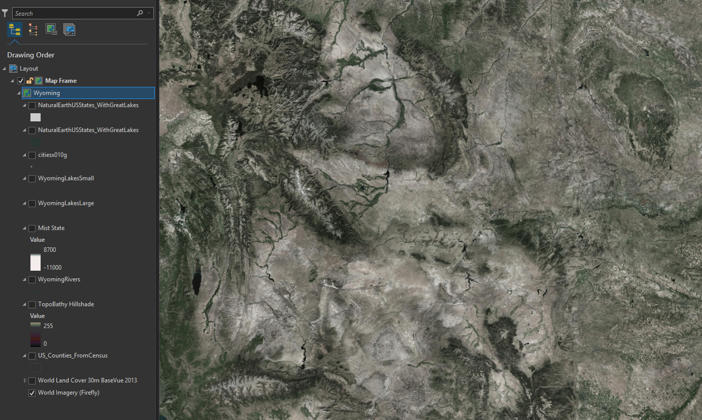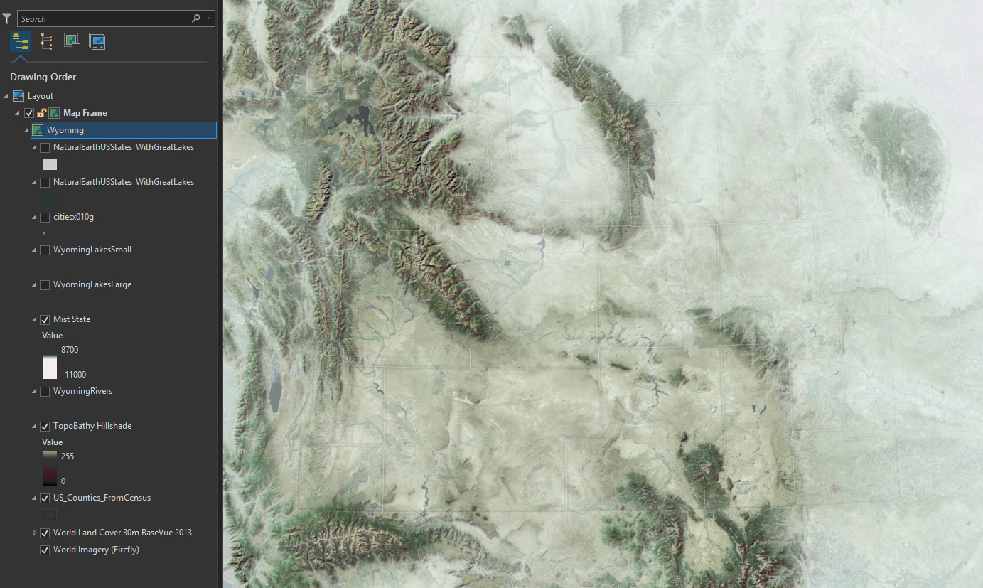 But this is going to be a physical map, so while the Firefly Imagery provides a good textured tonal base, I want to add a cartographic Land Cover layer to paint back in some contrived hues.
