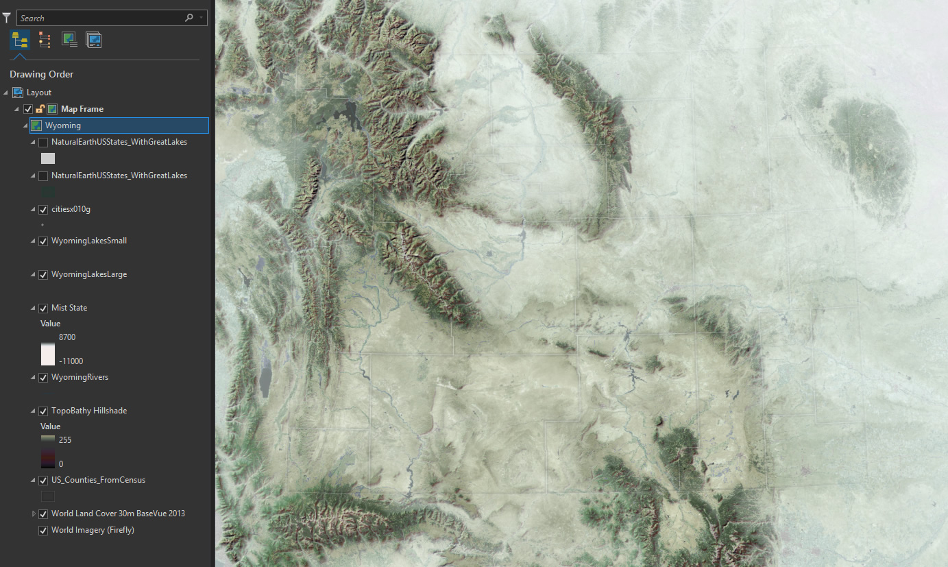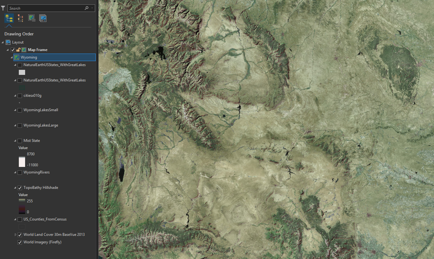 The topographic relief of Wyoming is magnificent. I want to call attention to the beautiful, and variable, ruggedness of the state. So I pulled in a hillshade layer from the TopBathy set…