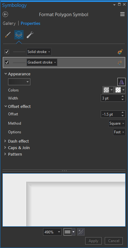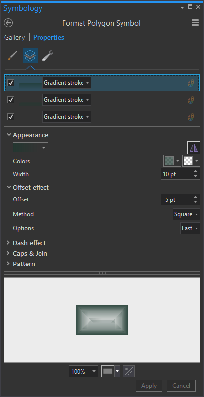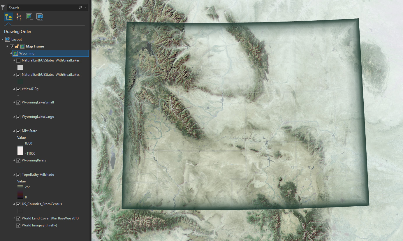 The visual goal of this is to make the border of Wyoming look like a cool vignette, wrapping around the state and mega-framing the theme and content. I gave the symbology a few gradient strokes (make sure you give them negative offsets of half the line width, so they render inside the state (positive offset if you wanted them to render outside the state, like a dropshadow).
