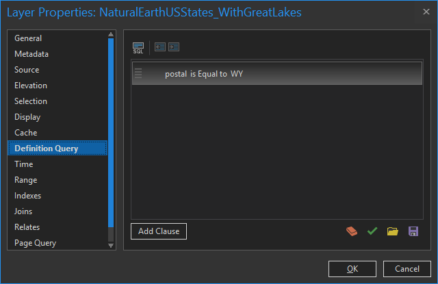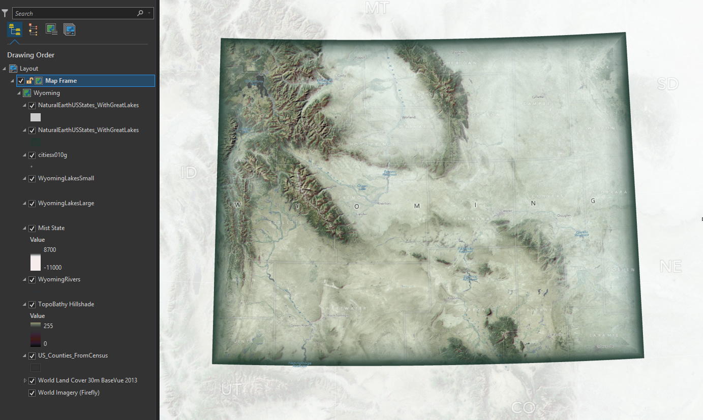 Next I added a states layer, also from Natural Earth. But in this case I only wanted to show the state of Wyoming, to set a visual focus for the map. How can you only show one state from within the states layer? A definition query! The visual query builder made it easy, even for a stooge like me. Definition queries quickly became a tireless ally of mine in this project. For what it’s worth, I also used them to show only larger-population towns in the step above.