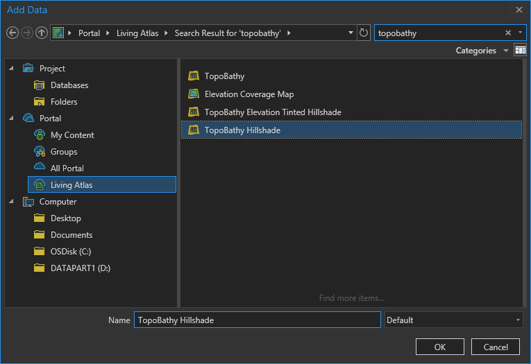 In the Add Data dialog, there are lots of ways to bring content into your project. I suggest you explore what is available in the Living Atlas, a curated warehouse of great, hosted, content. I’ll make lavish use of it in this map. By choosing the Living Atlas source and searching for “Firefly” I find and add the Firefly Imagery service.