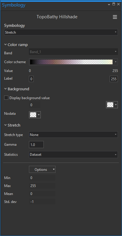But the default grayscale appearance is of little use to me, so I play with colors and opacities in the Color Scheme Editor and get a color ramp that has fully transparent mid-tones so the underlying map doesn’t looked washed out; rather, it has been bumpified. More on that here.