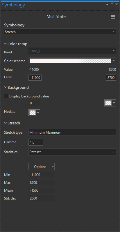 By default, it looks like the typical DEM ramp of black to white. But you can perform all sorts of color/opacity shenanigans to make it paint in a misty white only at the lowest elevations.