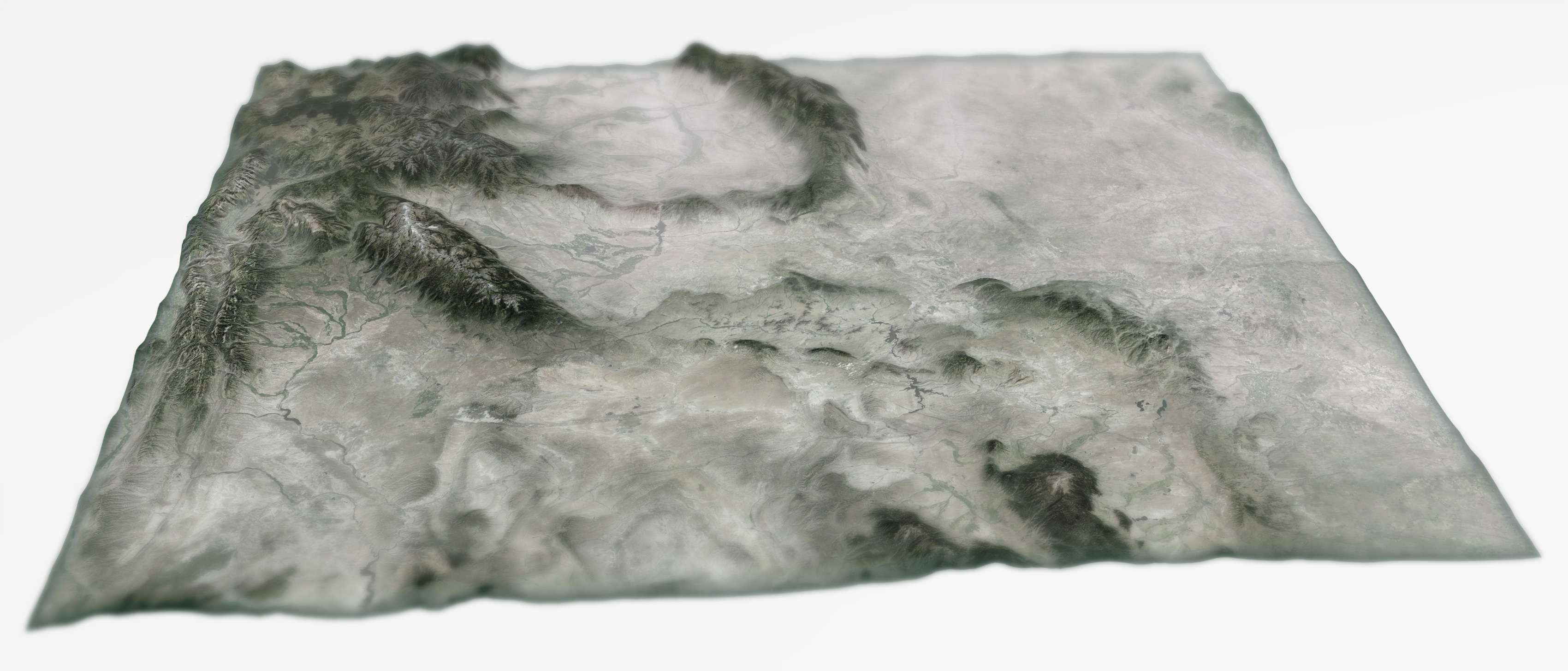 The result is an elevation layer that replicates a ghost-like mist that clings to lowlands and meanders up and through mountain valleys. High elevation mountains are revealed in crisp clarity as they rise above the wispy plains. This gives the map a painterly sense of forced reality. Find more self-indulgent examples here.