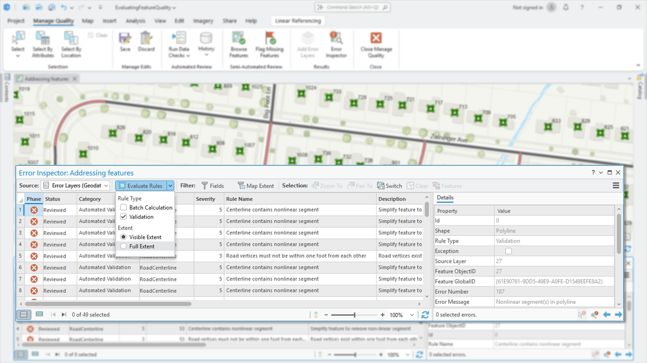 Regardless of whether you’ve implemented your rules using Data Reviewer checks or Arcade scripts, the workflow for evaluating your data’s quality is the same. Where Data Reviewer checks differ from Arcade scripts is in how data validation is performed. In validation attribute rules, Data Reviewer’s checks do not rely on Arcade to perform data evaluation. Instead, checks leverage a validation engine that is purpose-built to efficiently query and analyze spatial data. This engine provides improved performance by optimizing queries on your geodatabase, combining multiple rules during validation and generating error results that more precisely depict error conditions.