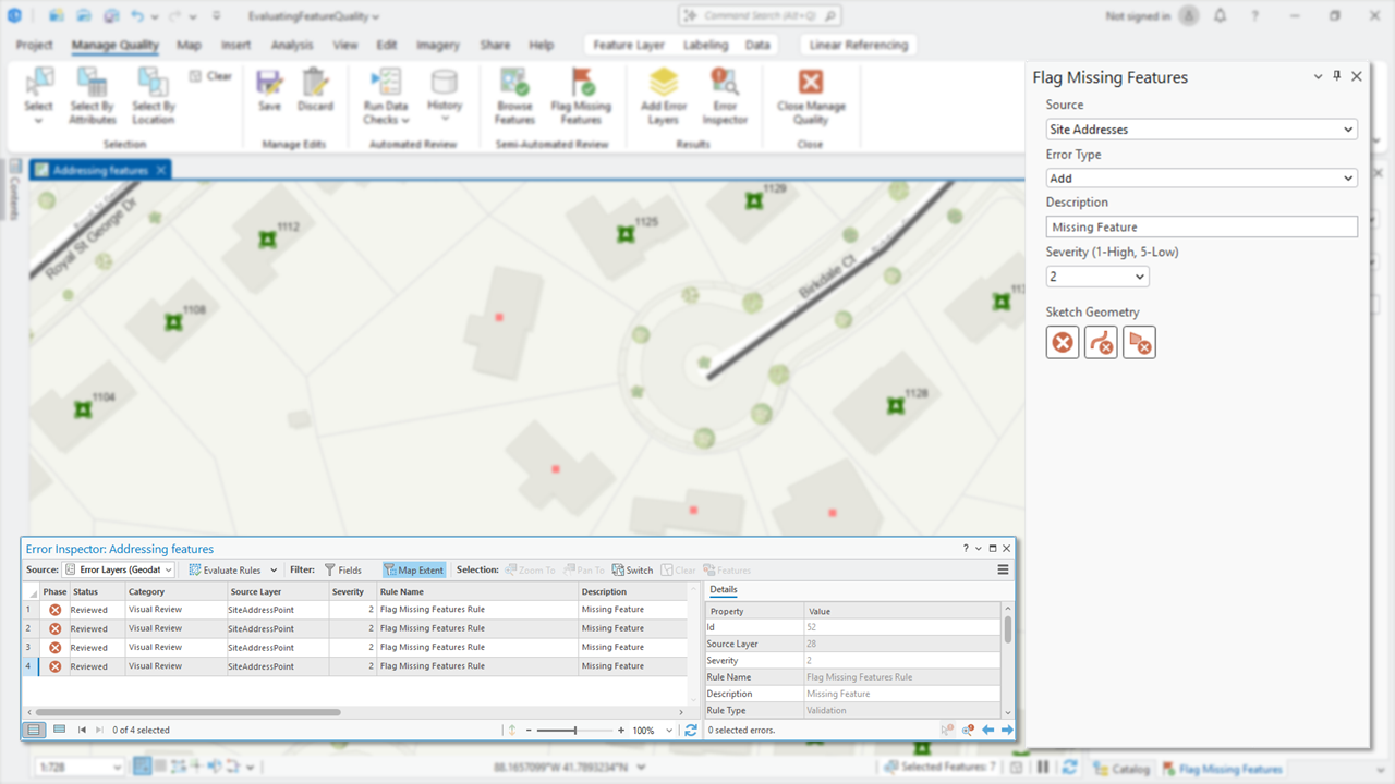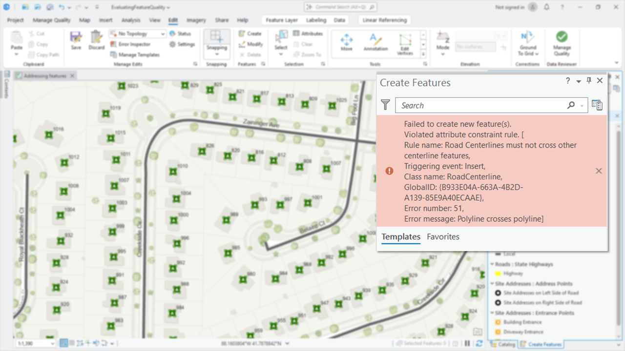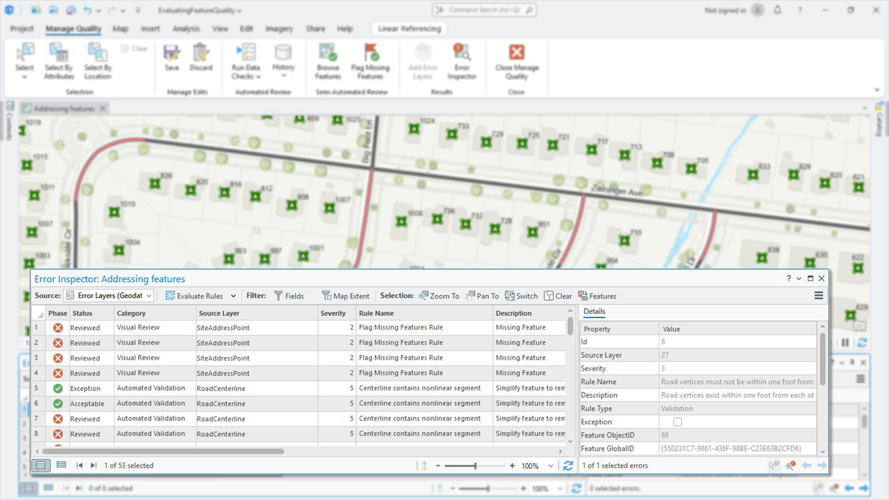 With validation attribute rules, you control when a feature’s quality is evaluated. For example, this could be a step in an editing workflow completed before posting your edits using tools found in ArcGIS Pro’s Error Inspector. Alternatively, you could create workflows that automatically validate features on a regular basis using geoprocessing and a schedule.